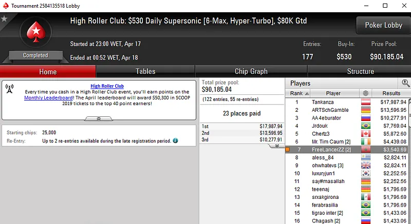 Para fechar as contas, Dattani foi 7º classificado entre 177 entradas no $530 Daily Supersonic [6-Max, Hyper-Turbo] e levou para casa mais $3.540.