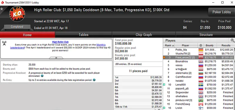 Já no $1.050 Daily Cooldown [8-Max, Turbo, Progressive KO], que contou com 94 entradas e distribuiu $100K em prémios, o luso também subiu ao terceiro lugar do pódio para receber $11.270.
