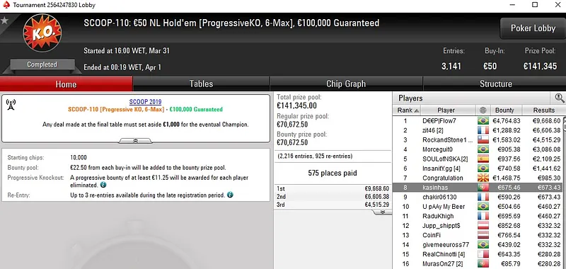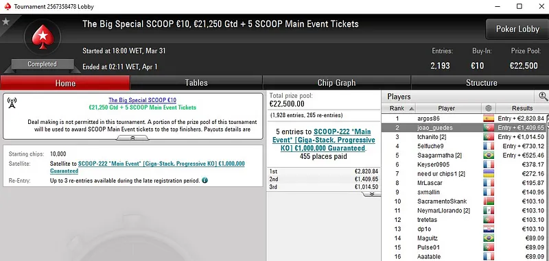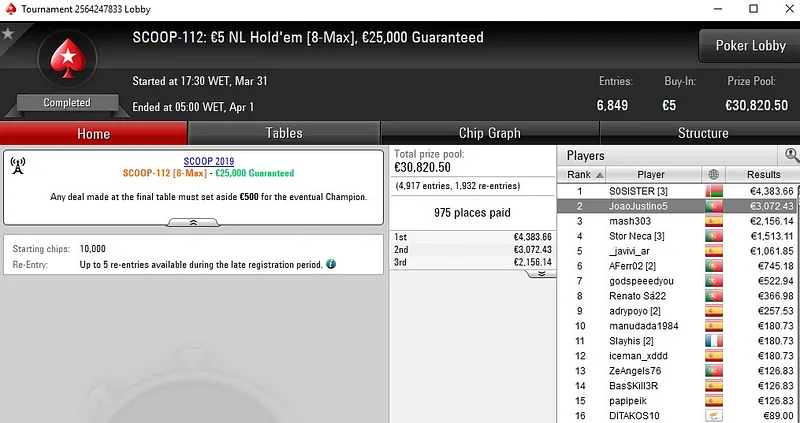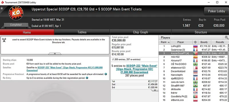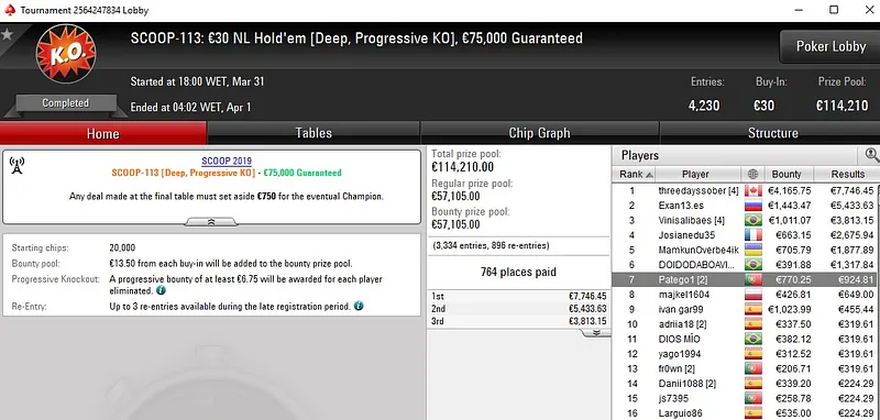 O segundo título do dia foi conquistado por M4XVALUE no SCOOP-122: €30 NLH ZOOM [TOTAL KO Duel]. Este evento viu 734 jogadores, que fizeram 266 reentradas, na luta por uma parte de €27K em prémios e foi o português quem levou a maior fatia do bolo, um prémio de €2.986.