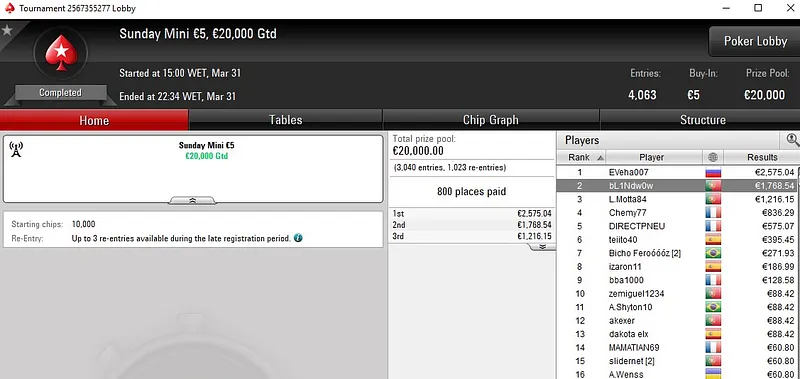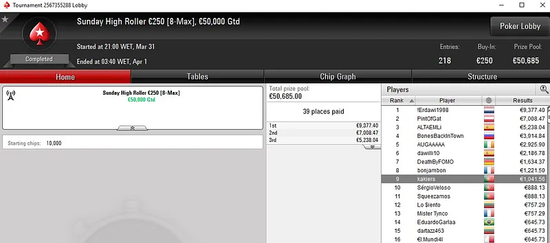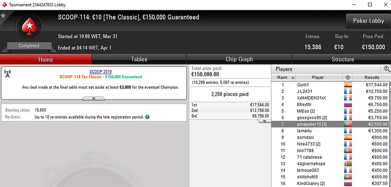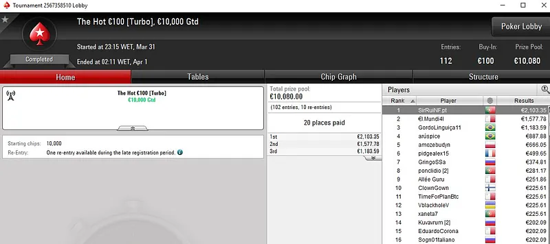 No que diz respeito aos torneios regulares, também tivemos vários portugueses a encaixar bons prémios, com destaque para a vitória de André "xunekas23" Marques no Afternoon on Stars €50 [8-Max]. Este torneio contou com 608 entradas e nenhuma delas conseguiu parar o jogador luso, que assim subiu ao lugar mais alto do pódio para receber um prémio de €4.577.