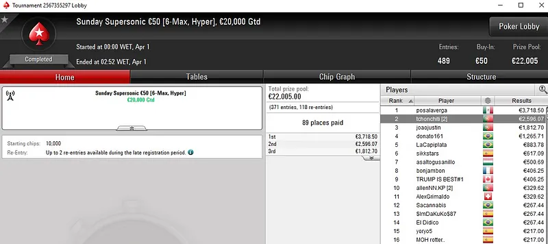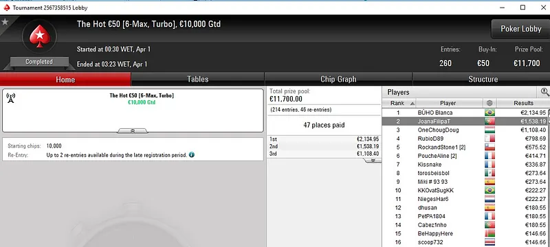 | 135 | 30 € | 23:00 | 6-Max Spring Time Hyper | 50,000 € |
