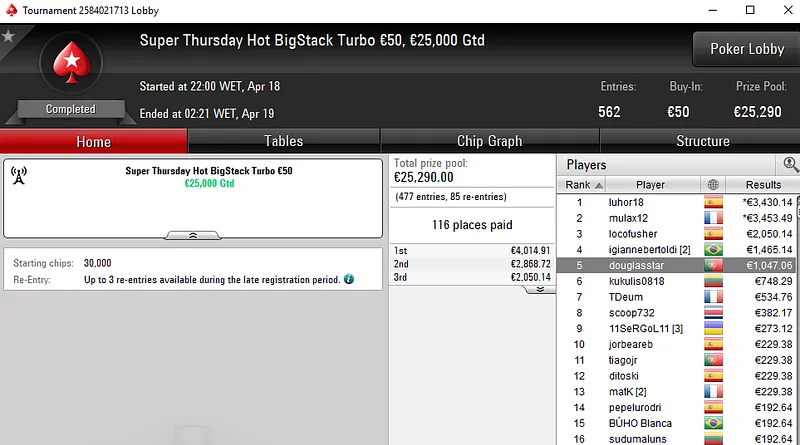 O jogador dono da conta Flipado foi quem encaixou o maior prémio nacional na quinta-feira de grind da PokerStars.pt. O luso colocou a bandeira verde e vermelha no topo do pódio do Super Thursday Bigger €10 e engordou a banca com um prémio de €3.511.