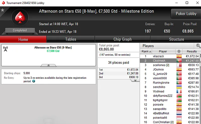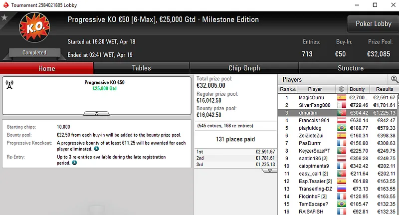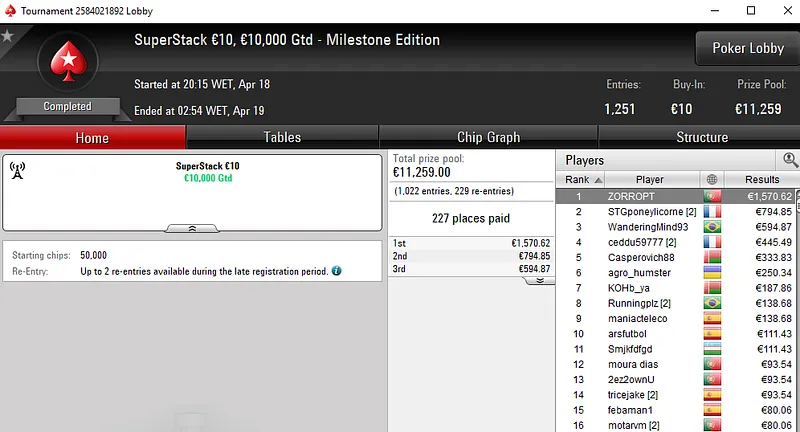 No High Roller €250 [8-Max], um dos dois torneios mais caros da sessão, ZéVitor1949 terminou no 2º lugar entre um field de 69 jogadores e garantiu €2.956. Também na mesa final esteve Fábio "wannab333" Dâmaso com direito €1.586 pelo quatro lugar.
