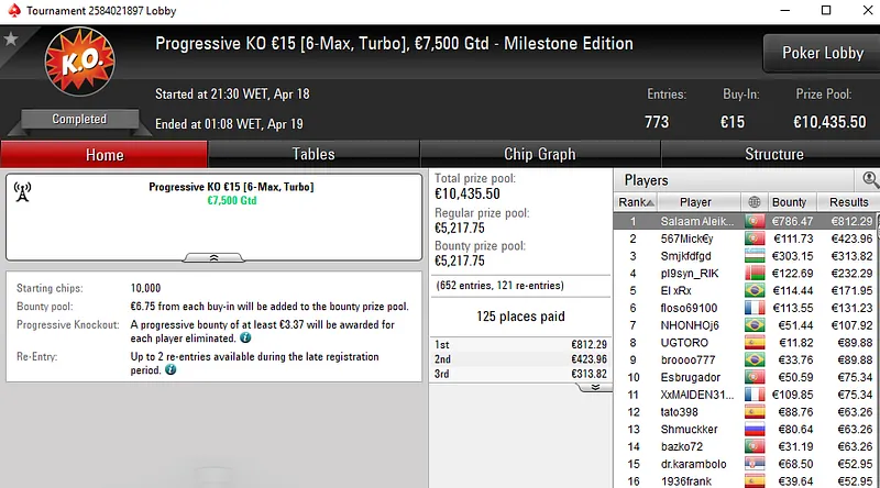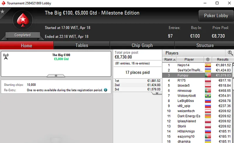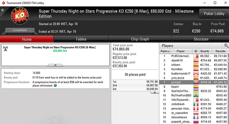 A fechar os destaques da sessão de quinta-feira temos uma medalha de ouro conquistada por motarvm no The Big €20. Neste torneio que registou 675 entradas e distribuiu mais de €12K em prémios, o tuga levou €1.917 pelo primeiro lugar.