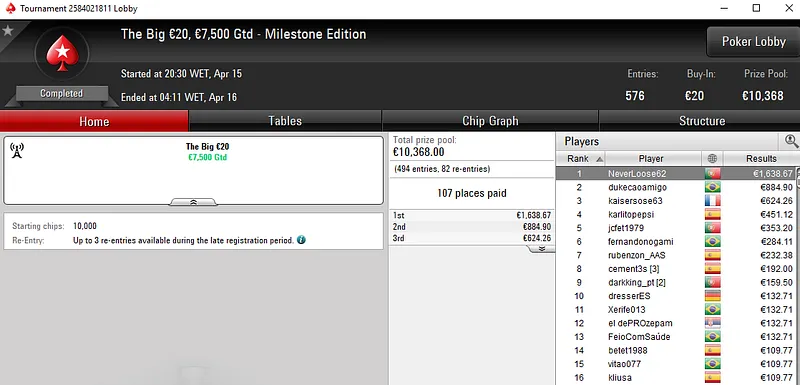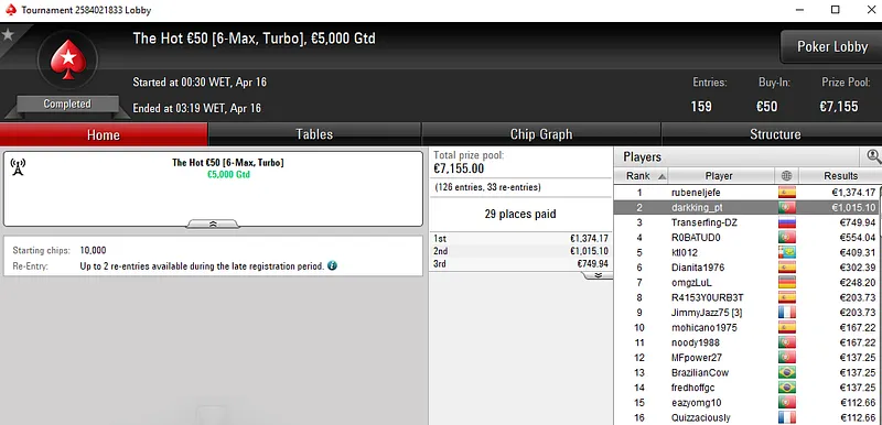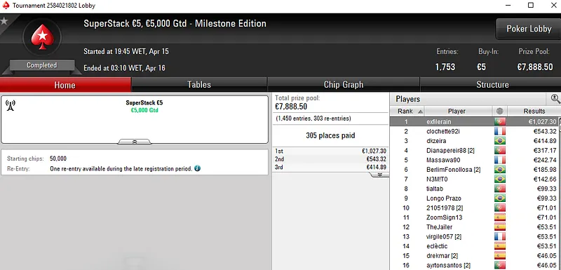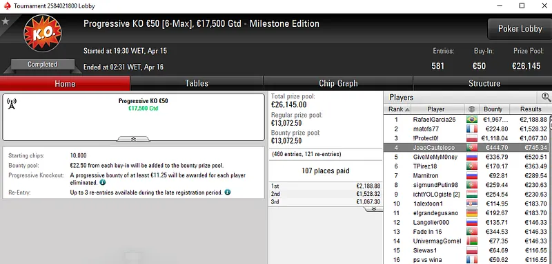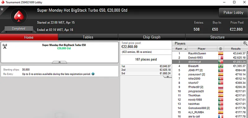 Outro jogador que também esteve em destaque na sessão de ontem foi Vítor "chilipe22" Abreu. O português foi o melhor entre um field de 1.822 no Super Monday Uppercut €20 e transformou três balas de €20 num prémio de €4.308 em pouco menos de seis horas de jogo.
