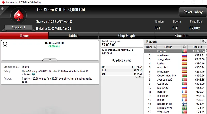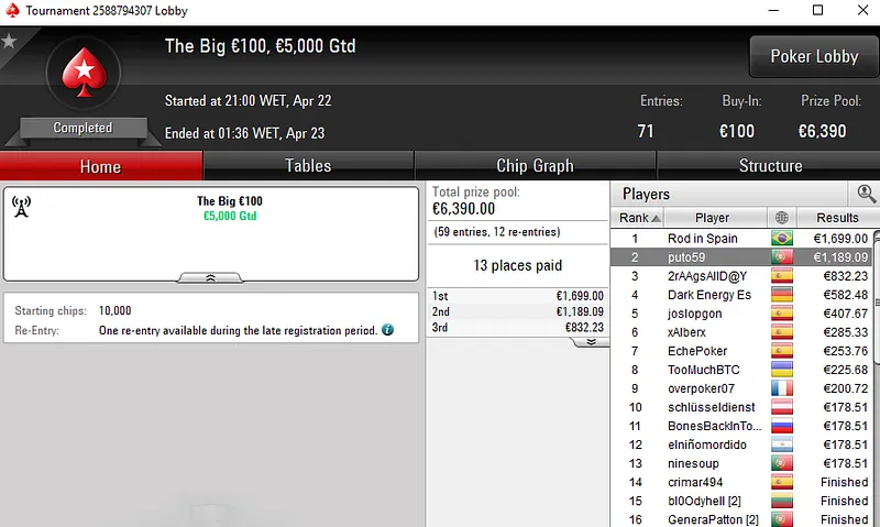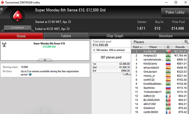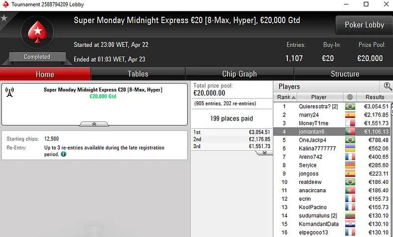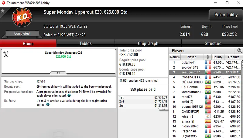 Quem também faturou um prémio de quatro dígitos nesta Super Monday foi o jogador dono da conta kerrlos. O português bateu toda a concorrência no The Big €10 e transformou um buy-in de €10 num prémio de €2.170 em oito horas de jogo.