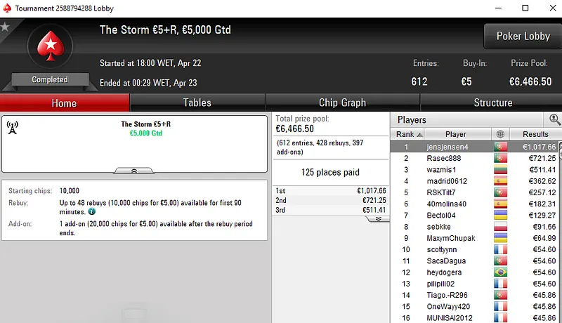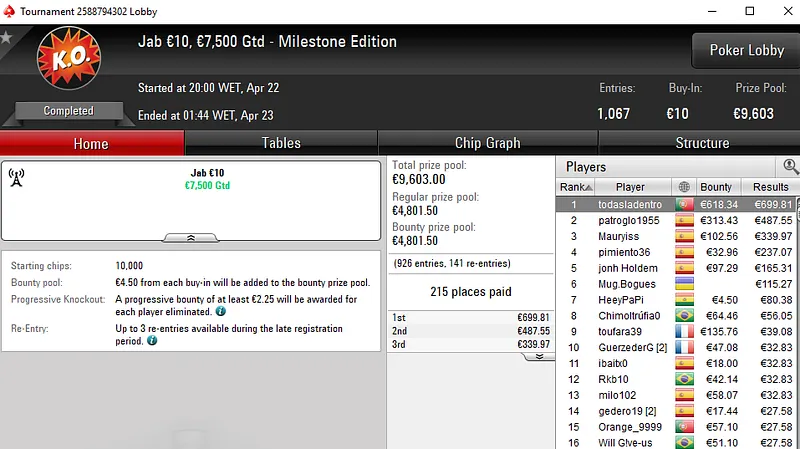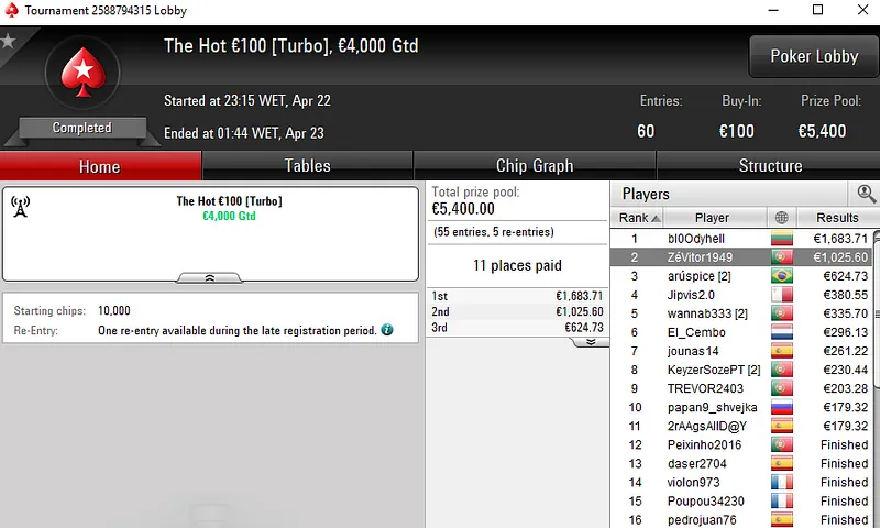 Também no pódio terminou o seu compatriota killer2090, que engordou a banca com um prémio de €1.903 ao terminar no terceiro lugar.