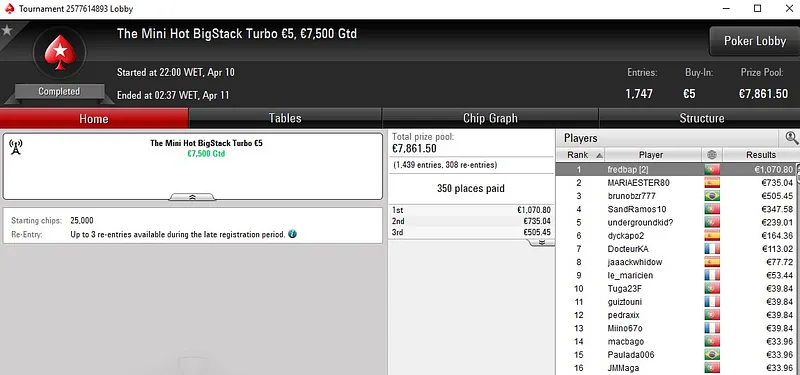 Este torneio contou com 1.681 entradas, distribuiu €45K em prémios e o português encaixou €4.594 ao terminar no segundo lugar do pódio. Pufadinha ficou com a medalha de bronze e faturou um prémio de €3.224.
