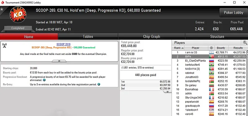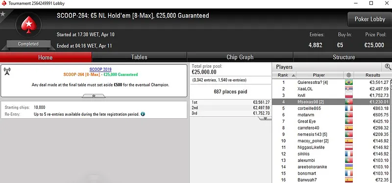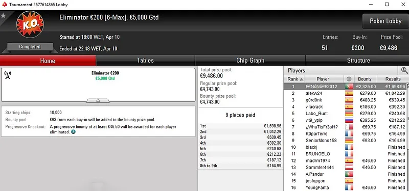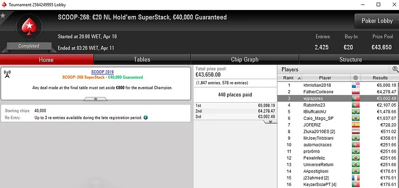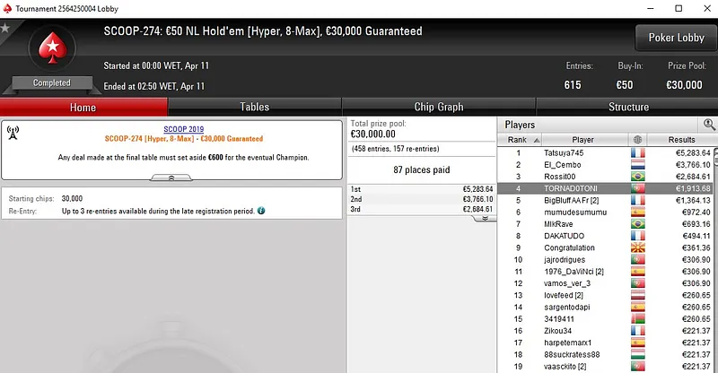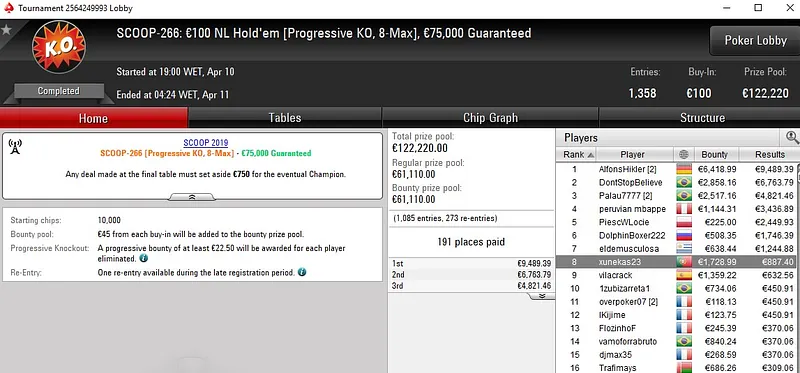 CrushMeDonk foi o melhor dos três e engordou a banca com €4.311. 20 coçar foi quarto classificado para €3.073 e andreia259 levou para casa €2.190 pelo quinto lugar.