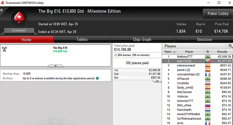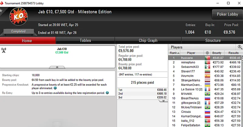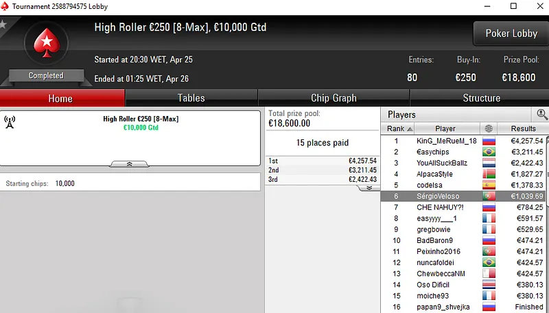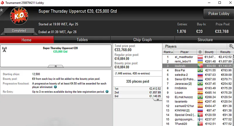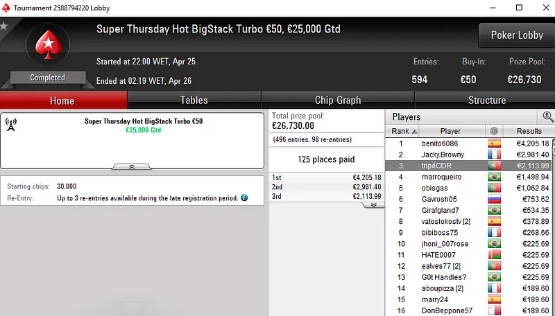 A fechar os destaques do dia temos luis sant133, outro dos tugas que garantiu um título na Super Thursday da PokerStars.pt. A vitória foi conquistada no Hook €30 após luis sant133 bater um field de 1.119 entradas para receber €3.793.