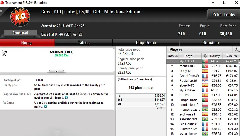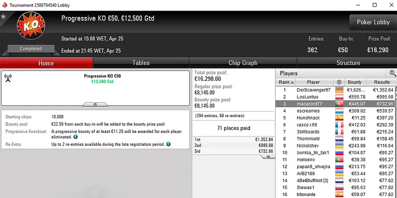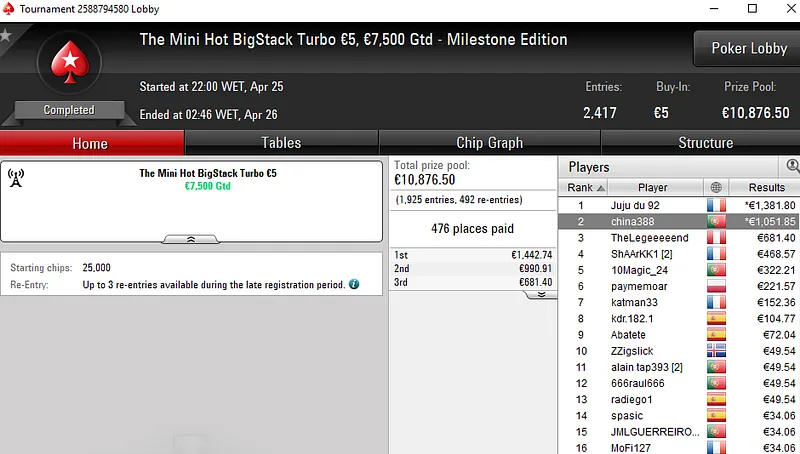 O maior prémio do dia foi para a conta de Manuel "TONAD0TONI" Machado, jogador que ficou muito perto de vencer o Super Thursday Night on Stars Progressive KO €250. O luso só não bateu um dos 337 adversários que teve pela frente e encaixou €5.930 ao terminar no segundo lugar.