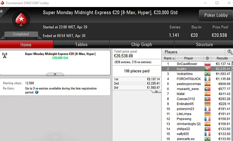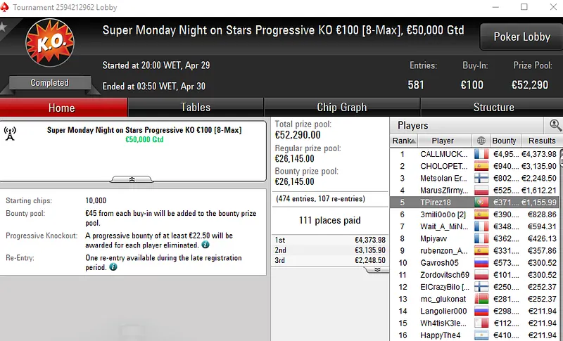 Já nos torneios regulares da Super Monday, foi Ramborama quem engordou mais a banca ao vencer o Super Monday Uppercut €20. O luso bateu um field de 1.959 entradas e levou para casa a medalha de ouro e um prémio total de €4.327.
