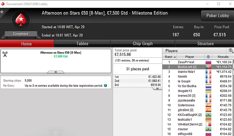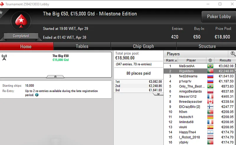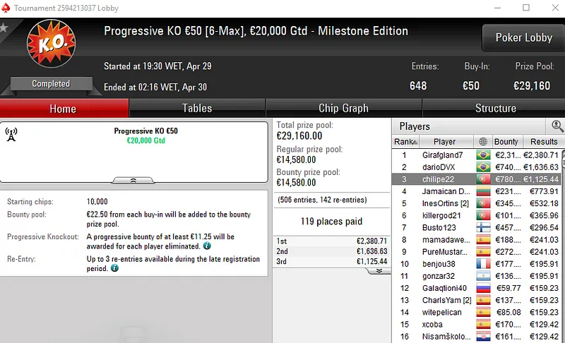 Portugal colocou dois jogadores na mesa final - JOAOZINHOANAO subiu ao terceiro lugar do pódio para receber €7.479 e o seu compatriota Nuno "eazyomg10" Regadas encaixou um prémio de €5.157 ao terminar no quarto lugar.