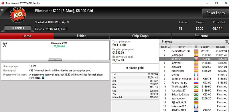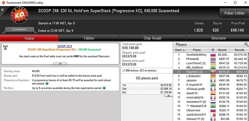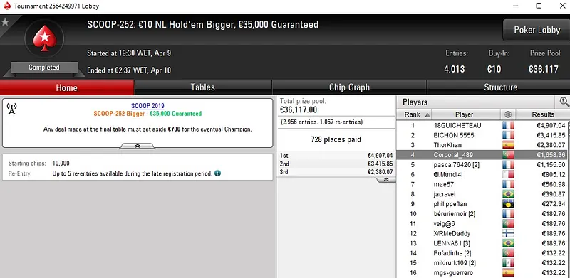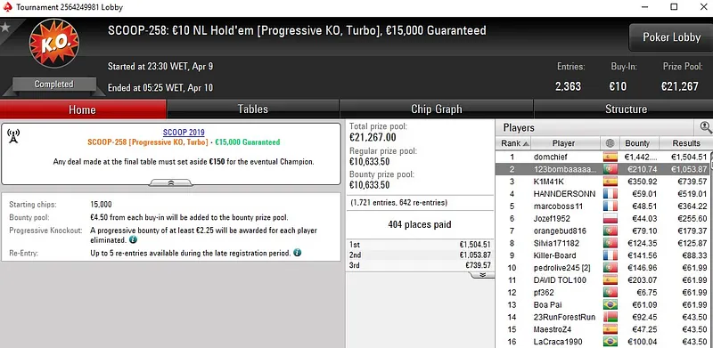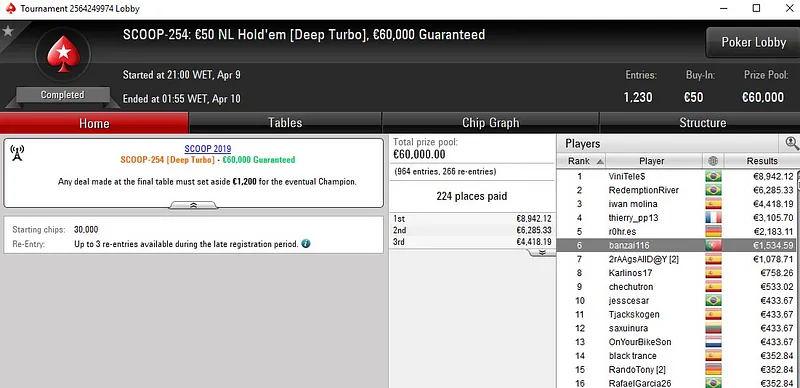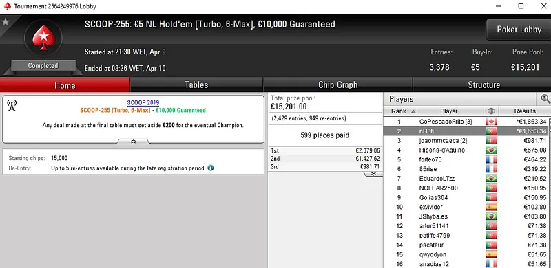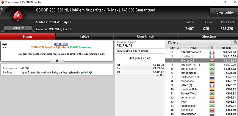 Já killergod21, registou um bom resultado no SCOOP-253: €20 NLH SuperStack [6-Max]. O luso esteve entre os três finalistas que fizeram um acordo e engordou a banca com €4.432 ao terminar no terceiro lugar do pódio.