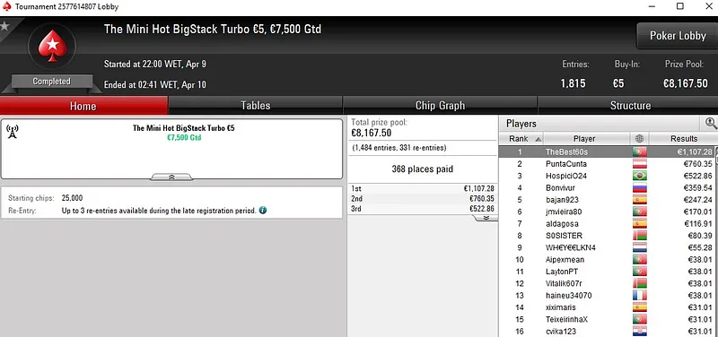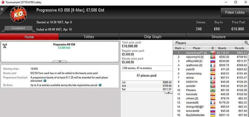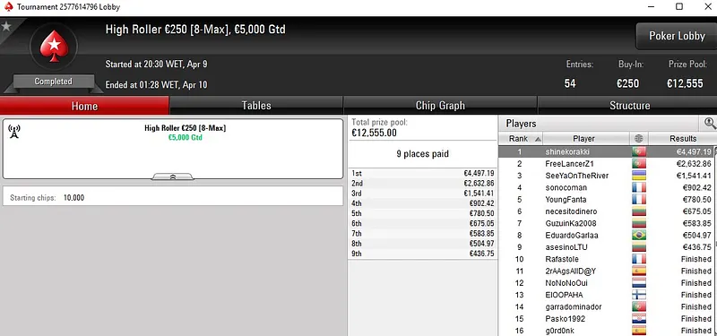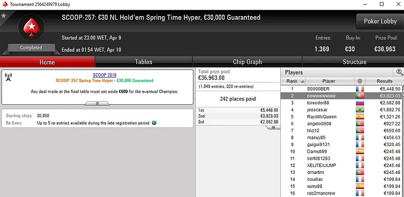 | 272 | 30 € | 23:00 | 6-Max Spring Time Hyper | 30,000 € |