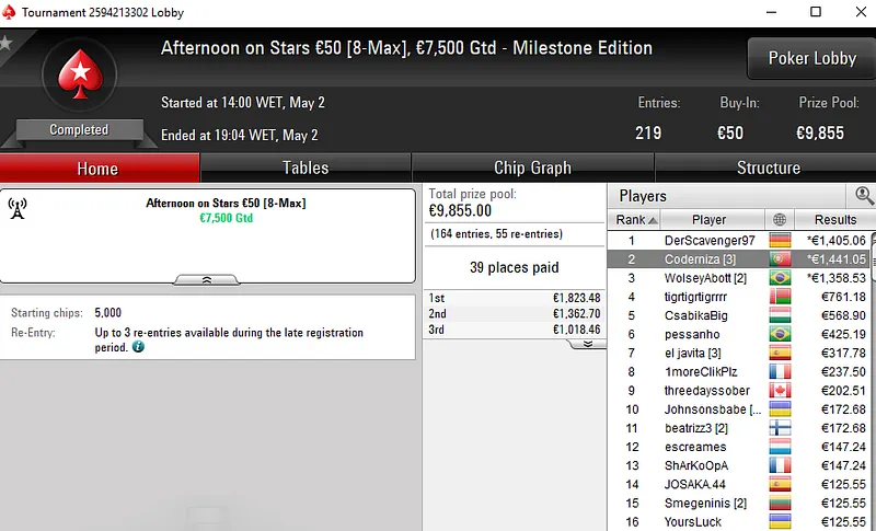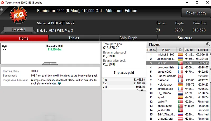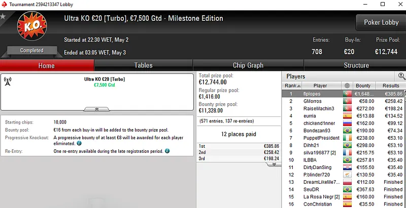O Super Thursday Bigger €10 registou 3.832 entradas e o título foi decidido num heads-up entre dois portugueses. "biberus78" levou a medalha de ouro e €4.441 enquanto o seu compatriota "putSOMEcream" encaixou €3.051 ao terminar no segundo lugar.