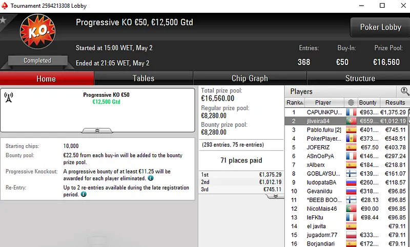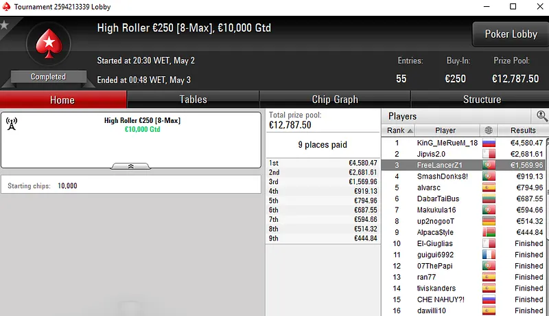 A fechar os destaques de ontem temos a mesa final de "JKKPKR" no Super Thursday Nigh on Stars PKO €250. Este torneio viu 306 jogadores na luta por uma parte dos €71.145 em jogo e o luso foi 5º classificado para um prémio de €3.551.