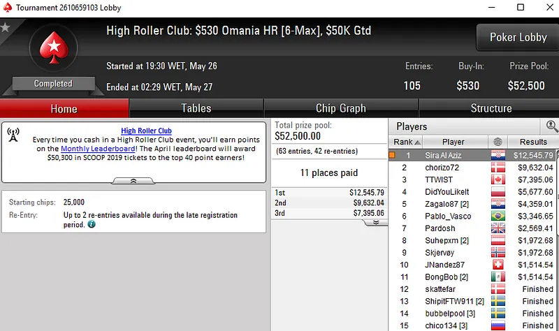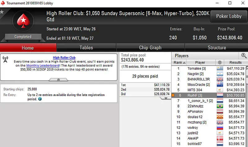 No High Roller Club da PokerStars, André "Sira Al Aziz" Santos despachou um field de 105 entradas no $530 Omania HR [6-Max] para $12.545 e Rui "RuiNF" Ferreira foi 6º no $1.050 Sunday Supersonic para $10.700.