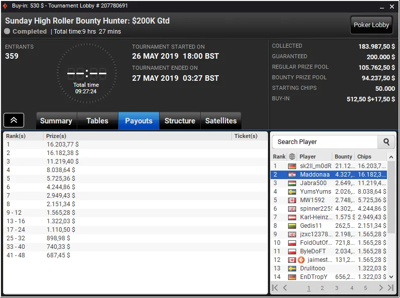 Já Pedro "Maddonaa" Marques foi segundo classificado entre um field de 359 entradas no Sunday High Roller Bounty Hunter e levou para casa um prémio total de $20.509.