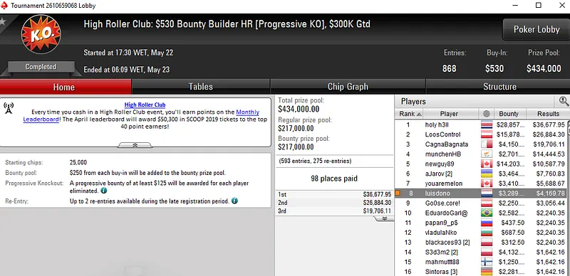 Também no High Roller Club, tivemos Manuel "fellatiado" Ruivo na mesa final do $1.050 Wednesday HR [8-Max] (4º para $16.651) e Luís "luisdono" Dono entre os finalistas do $530 Bounty Builder HR PKO (8º para $7.458).