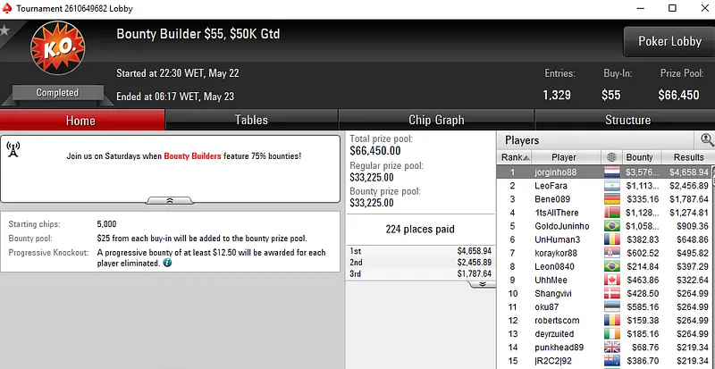 Já no Bounty Builder $55, o título veio para Portugal, com Jorge "jorginho88" Abreu a bater um field de 1.329 entradas para engordar a banca com um prémio de $8.235.