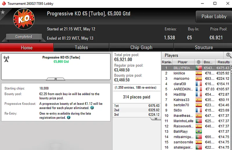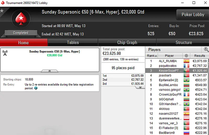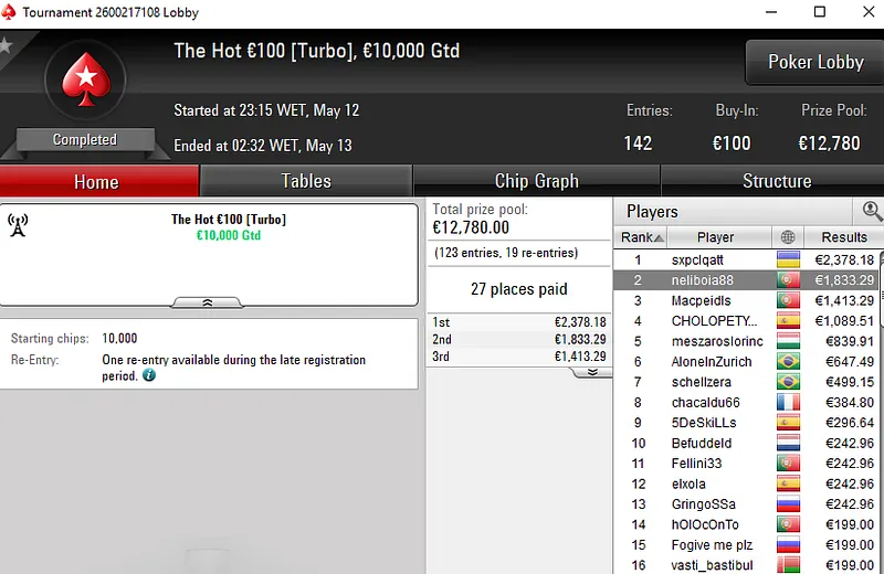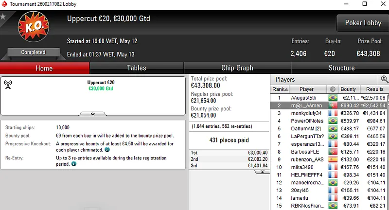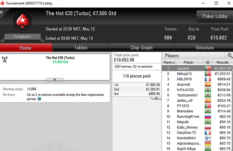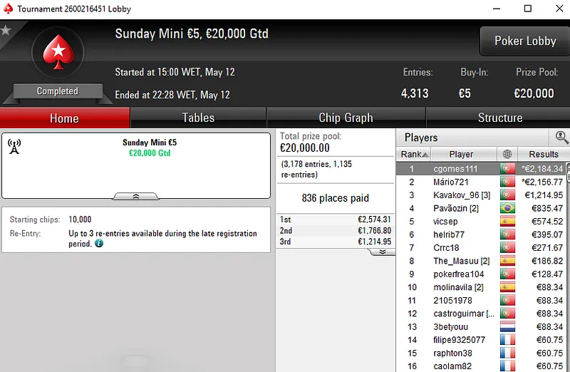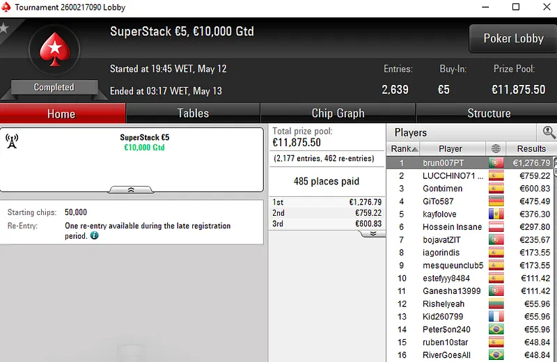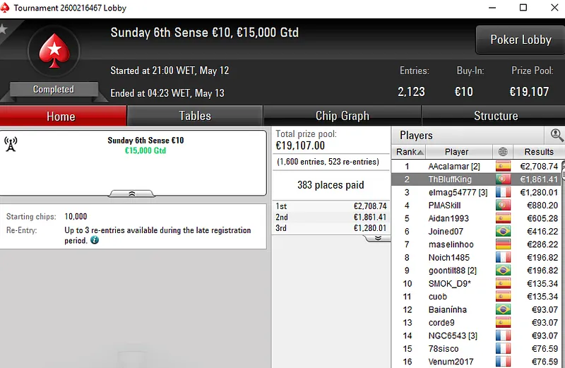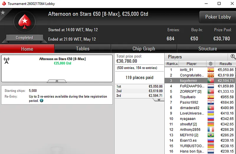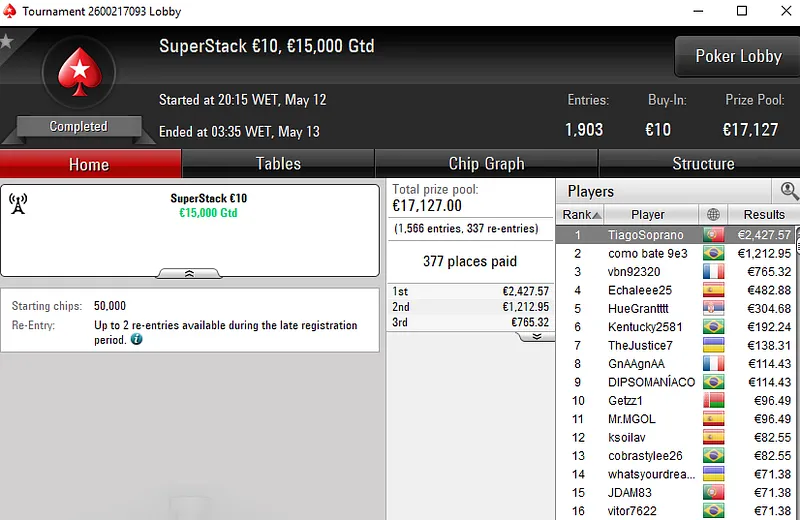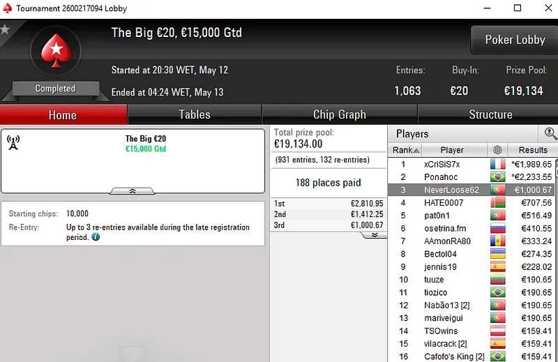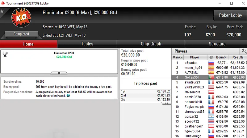 O tuga dono da conta "ToniiDoRock" só não bateu um dos adversários que teve pela frente e encaixou um prémio de €7.199 ao terminar no segundo lugar.