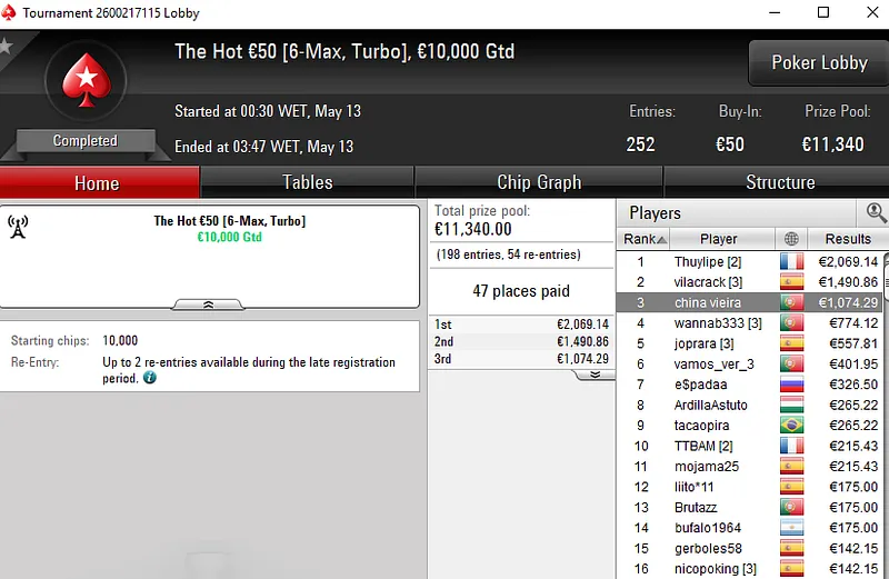 Já Henrique "policy10" Pinho, por pouco não venceu o Sunday Hot BigStack Turbo €50. A edição de ontem deste torneio viu 1.079 entradas na corrida por uma parte de €48,5K em prémios e o português engordou a banca com €4.930 ao terminar no 2º lugar.