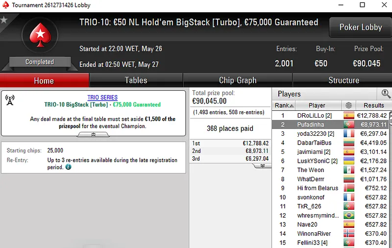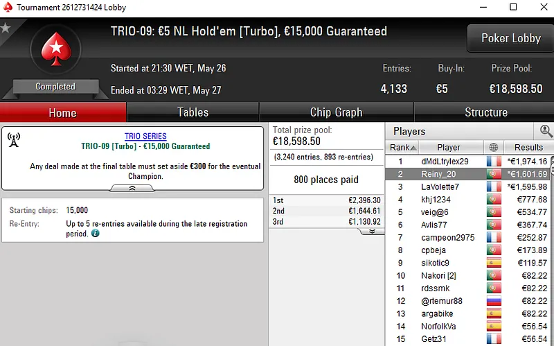 O título foi conquistado por André "andrelopes11" Lopes no TRIO-03: €5 NLH [Progressive Ko, 6-Max]. O português bateu um field de 6.895 entradas e transformou um buy-in de apenas €5 num prémio de €3.076.