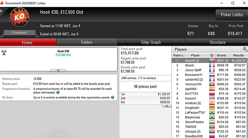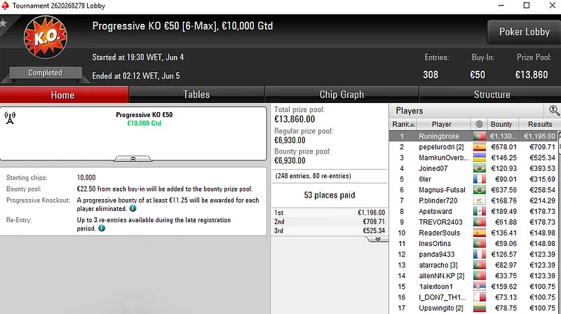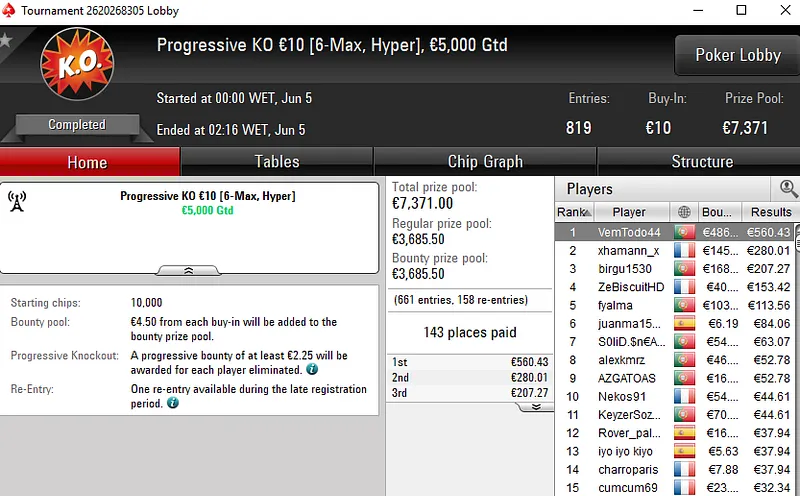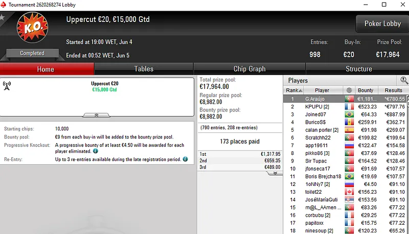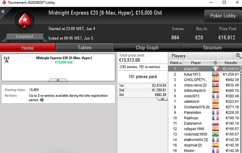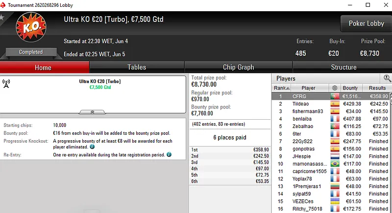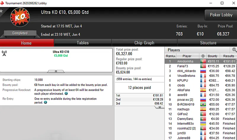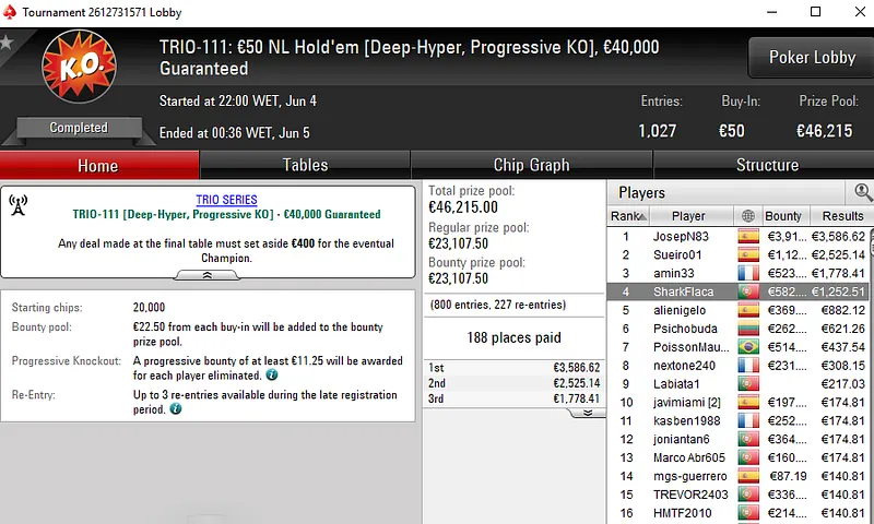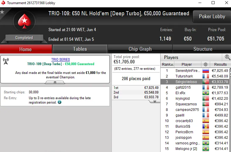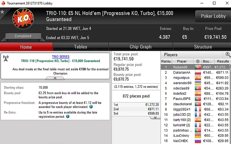 Quem também assegurou um título para Portugal foi Rúben06, campeão do TRIO-110: €5 NLH [PKO, Turbo]. Este evento registou 4.387 entradas, distribuiu quase €20K em prémios e para a conta do luso foram €2.269.