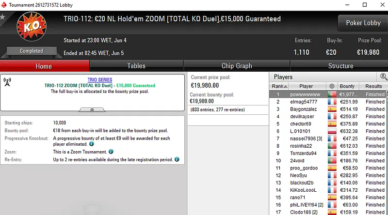 Já powwwwwww, bateu um field de 1.110 entradas no TRIO-112: €20 NL Hold'em ZOOM [TOTAL KO Duel] e encaixou um prémio de €1.977 pela vitória.