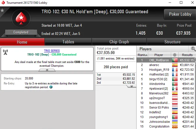 O título da sessão de terça-feira que rendeu o maior prémio luso foi conquistado por OtB_RetBaron. O português precisou de quase dez horas e meia para bater um field de 1.405 entradas no TRIO-102: €30 NLH [Deep] e viu os seus esforços recompensados com um prémio de €5.532.