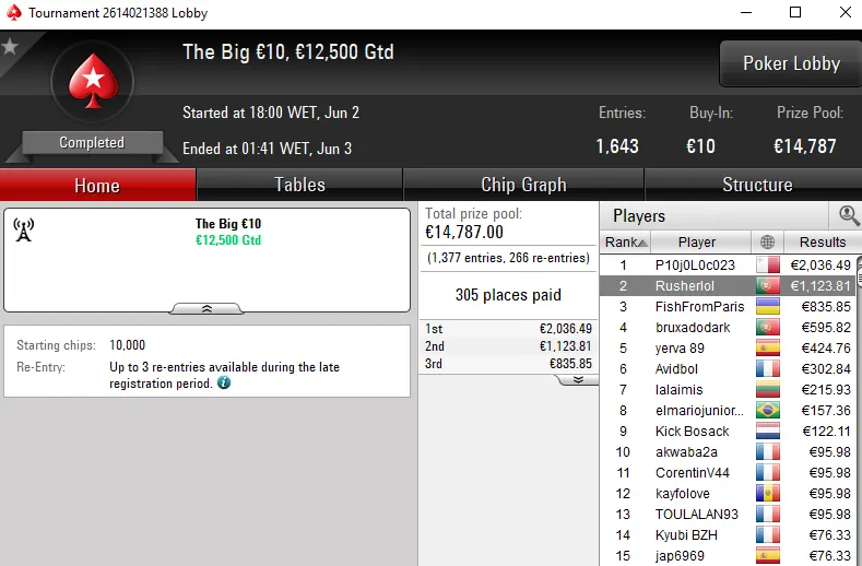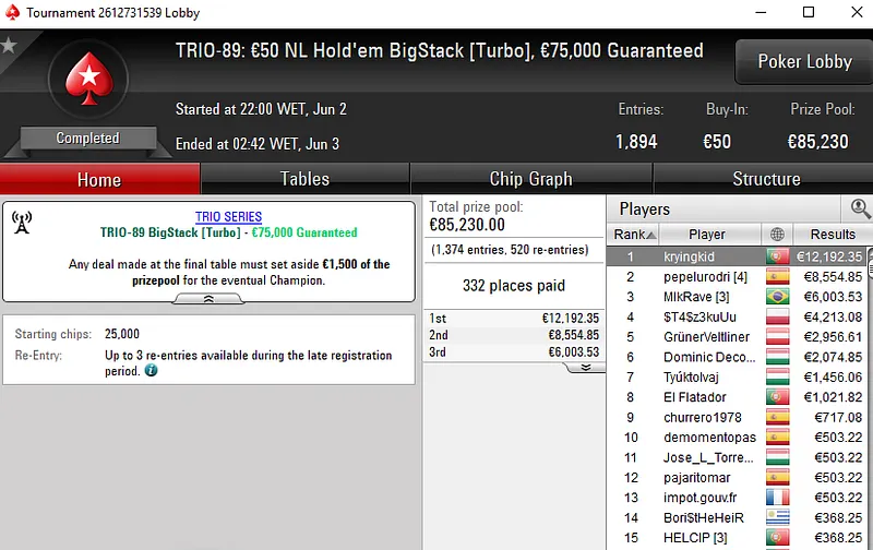 O dono da conta kryingkid foi responsável por um dos títulos e pelo maior prémio luso na sessão de ontem. O português bateu um field de 1.894 entradas no TRIO-89: €50 NLH BigStack [Turbo] e faturou €12.192.