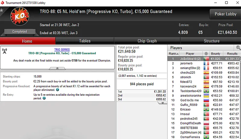 Quem também teve direito a uma medalha de ouro foi JoãoSilva18, jogador que despachou 3.666 jogadores no TRIO-88: €5 NLH [Progressive KO, Turbo] para transformar três balas de €5 num prémio de €2.411.
