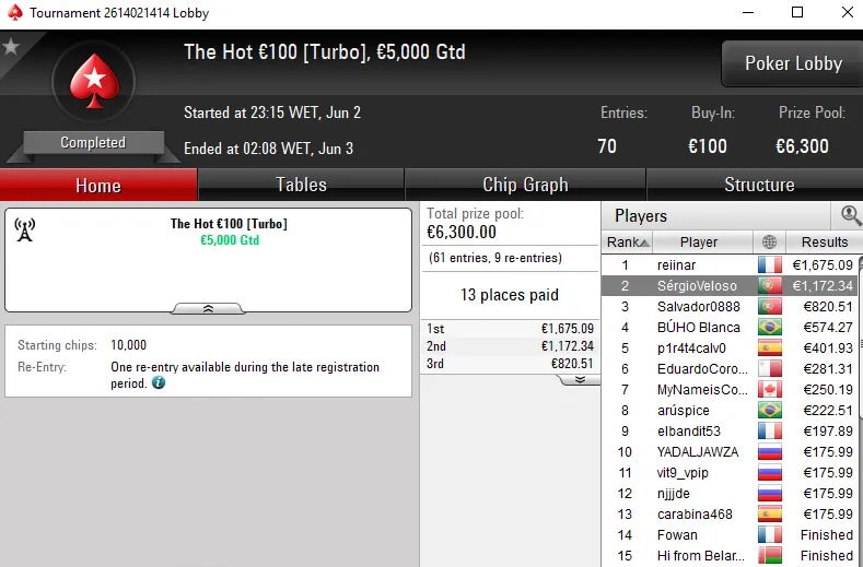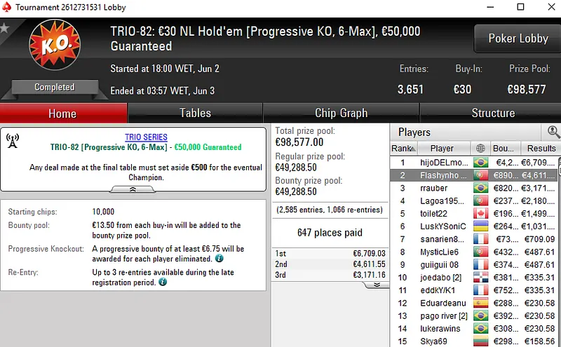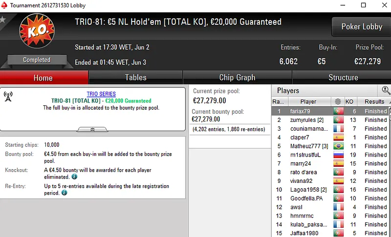 Já fariaz79, foi o campeão do TRIO-81: €5 NL Hold'em [TOTAL KO], evento que contou com 6.062 entradas. O luso somou seis eliminações no caminho até ao topo do pódio.