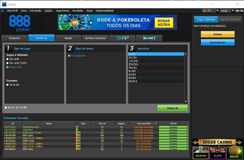 Para encontrares estes torneios no software da 888poker é muitos simples. No lobby de poker, clica em "Mesas" -> "Torneios" -> "Grátis" e depois procura os torneios com o nome "2.500€ Portugal vs Espana".