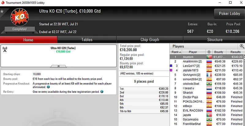 O MicroMillions-47: €10 The Classic [PKO] registou 13.419 entradas e o português despachou toda a concorrência em 9 horas e 10 minutos para levar o título e um prémio total de €8.883, resultante de um acordo entre os três finalistas.