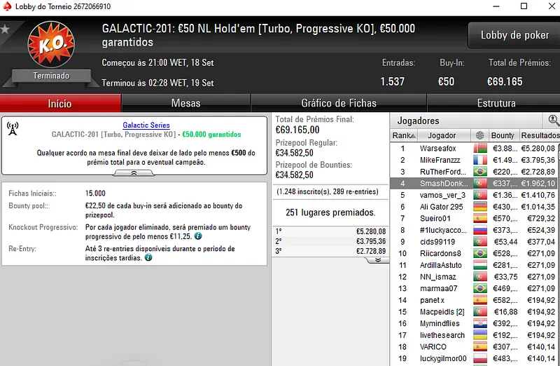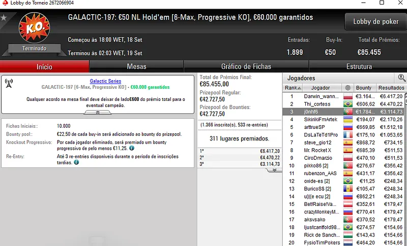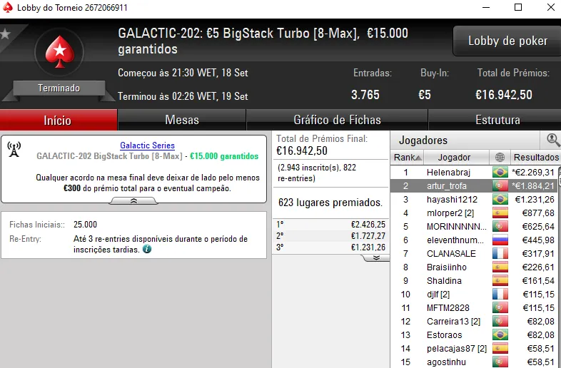 A completar o trio de vitórias, temos mike1bongi campeão no GALACTIC-196: €5 NL Hold'em Deep Micro MERCURY [6-Max]. Este evento registou 4.237 entradas e o luso despachou toda a concorrência para receber os €2.724 que estavam reservados para o campeão.