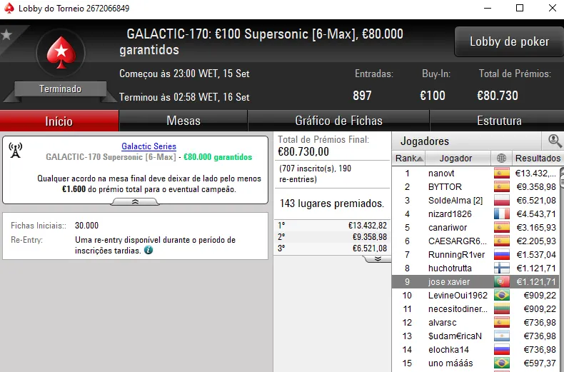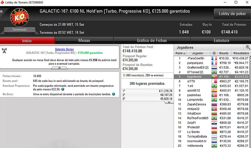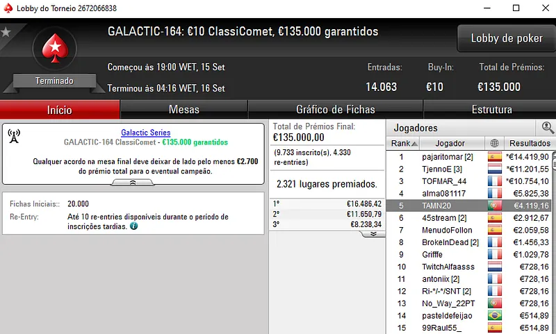 Já E.LOURENÇO, levantou o troféu no GALACTIC-168: €5 BigStack Turbo [8-Max] após bater o seu compatriota pedtanjoa no heads-up deste evento que contou com 4.963 entradas. O campeão levou um prémio de €3.183 e pedtanjoa foi recompensado com €2.265 ao terminar no segundo posto.