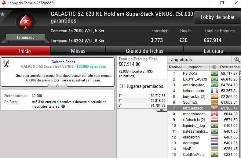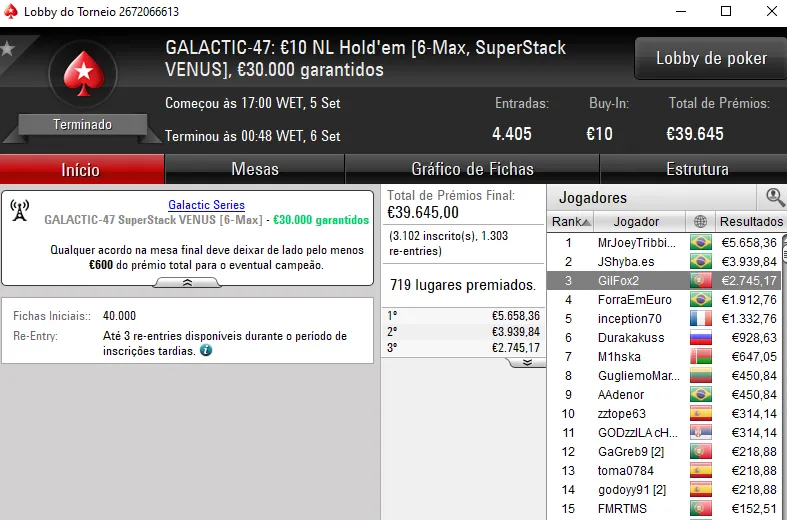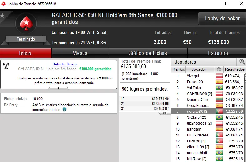 Quem também reservou um lugar no pódio deste evento foi o seu compatriota dono da conta pikko86. O luso foi o terceiro classificado e teve direito a um prémio de €3.896.
