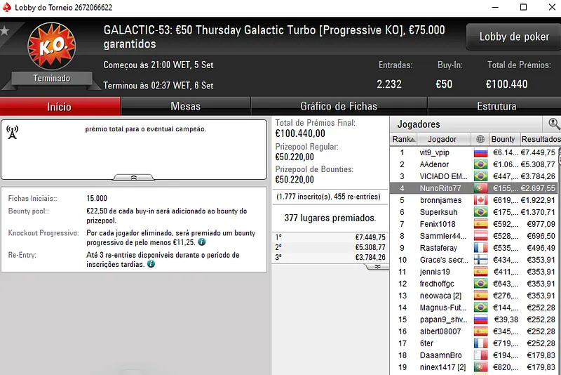 Minutos antes do resultado acima, pikko86 já tinha ficado muito próximo da vitória em outro evento da série. No GALACTIC-56: €20 MOONLIGHT Express [8-Max, Hyper], torneio que viu 2.808 entradas na corrida por uma parte dos €50,5K em jogo, o português foi o runner-up e engordou a banca com €5.872 em menos de três horas de jogo.