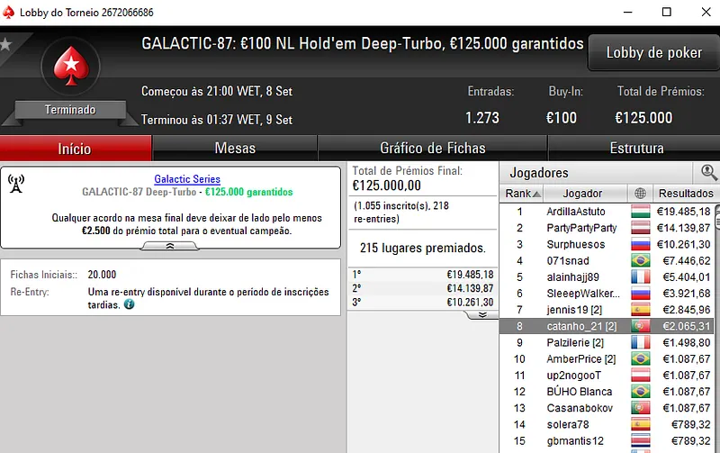 O GALACTIC-85: €50 [50 Special, Progressive KO] foi o único evento com duração de dois dias e terminou o Dia 1 com 443 sobreviventes de um field inicial de 7.207 entradas. Para o campeão estão reservados €23.033 (mais bounties) e temos vários tugas ainda em jogo, incluindo "patinho999" com a quinta maior stack para o Dia 2.