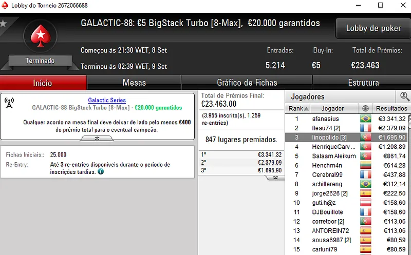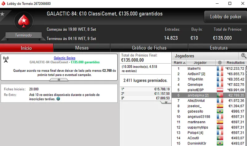 Quem também faturou cinco dígitos foi "XBRXNOX", segundo classificado no GALACTIC-90: €100 Supersonic [6-Max]. O luso transformou €100 num prémio de €10.304 em apenas quatro horas de jogo.