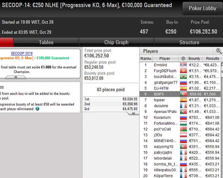 | 23:00 | SECOOP-29: €100 NLHE [Progressive KO,6-Max, Turbo] | 30.000 € |