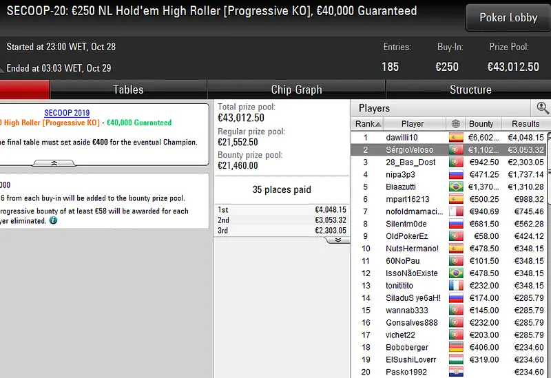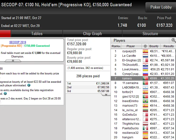 Já Ricardo "Rikardu7" Alves, levou a maior fatia dos quase €39.000 distribuídos no SECOOP-19: €20 Midnight Express [8-Max, Hyper]. Ricardo foi o melhor entre um field de 2.158 entradas e viu três horas de jogo recompensadas com um prémio de €5.501.