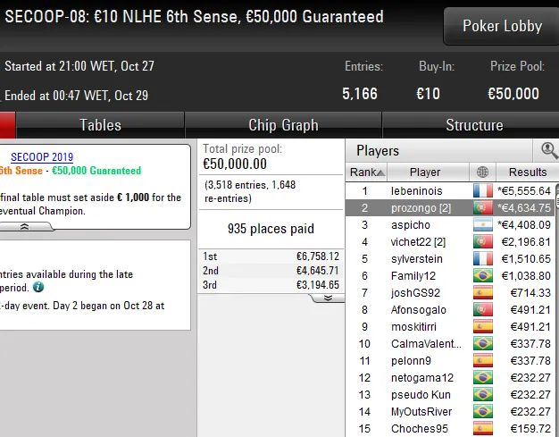 Muito perto do título ficou Rui "obisgas" Gabriel, o jogador português que encaixou o maior prémio no grind nacional de segunda-feira. Rui só não superou um dos 1.711 jogadores que teve pela frente no SECOOP-13: €50 NLHE [8-Max] e transformou três balas num prémio de €11.398 ao terminar no segundo lugar.
