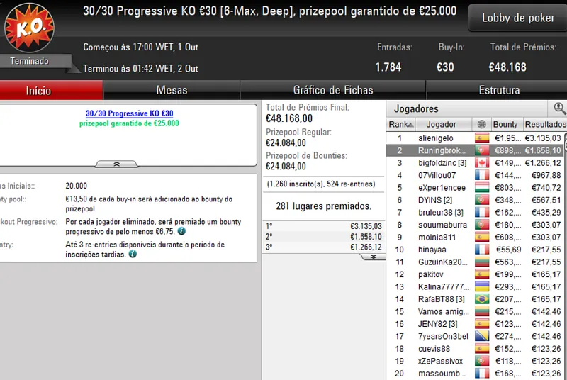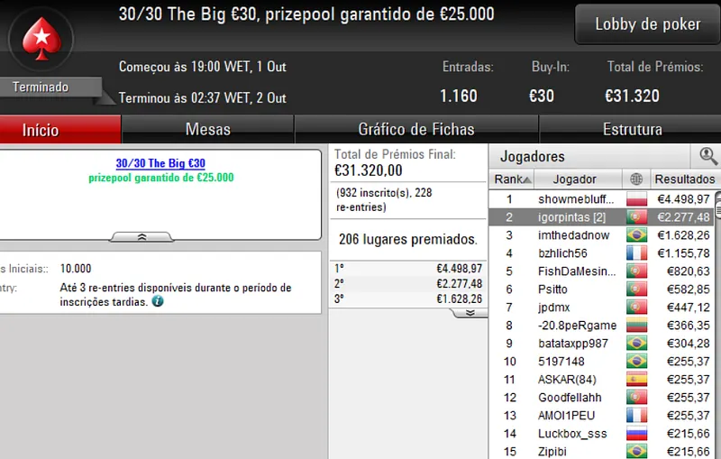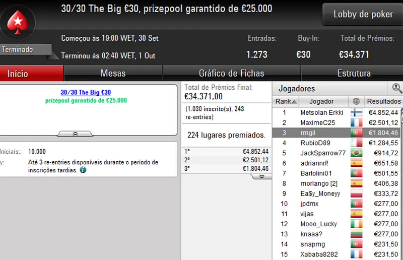 Quem também faturou um belo prémio nos torneios 30/30 foi "prrrc123". O jogador português participou num o acordo entre os três finalistas do Sunday Warm-Up €30, torneio que contou com um field de 3.783 entradas, terminou no 3º lugar e teve direito a um prémio de €7.457