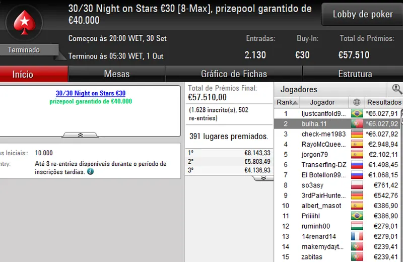 A outra vitória veio pelas mãos de "ZeAngels76". Na sessão de ontem, o luso despachou um field de 1.692 entradas no Night on Stars €30 [8-Max] e viu quase nove horas de jogo recompensadas com um prémio de €6.591.