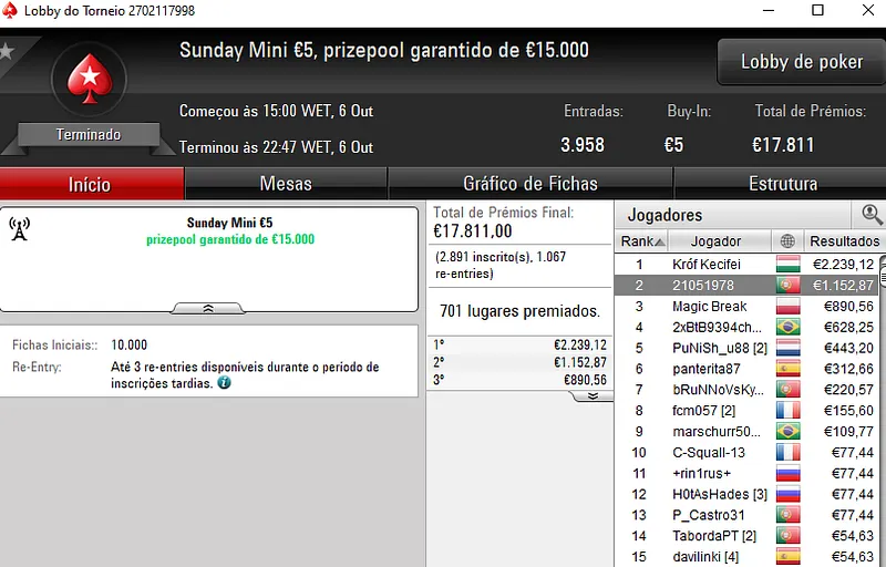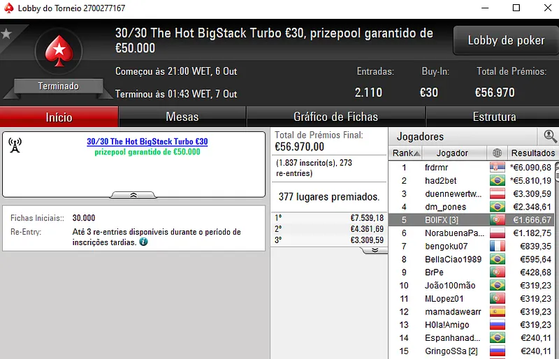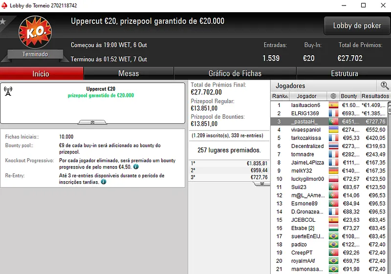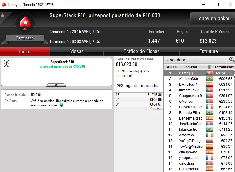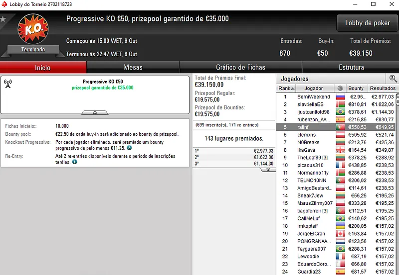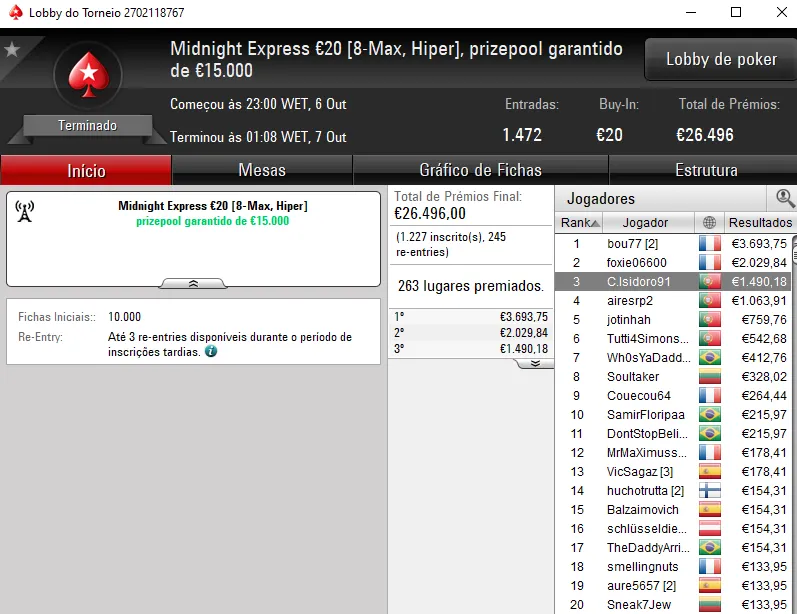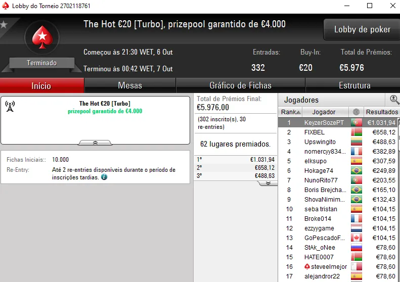 Já "RuiGamarra", sagrou-se campeão do Eliminator €200 [6-Max]. A edição de ontem deste torneio viu 95 jogadores na corrida por uma parte de €17.670 em prémios e o português foi o melhor para engordar a banca com €3.934.