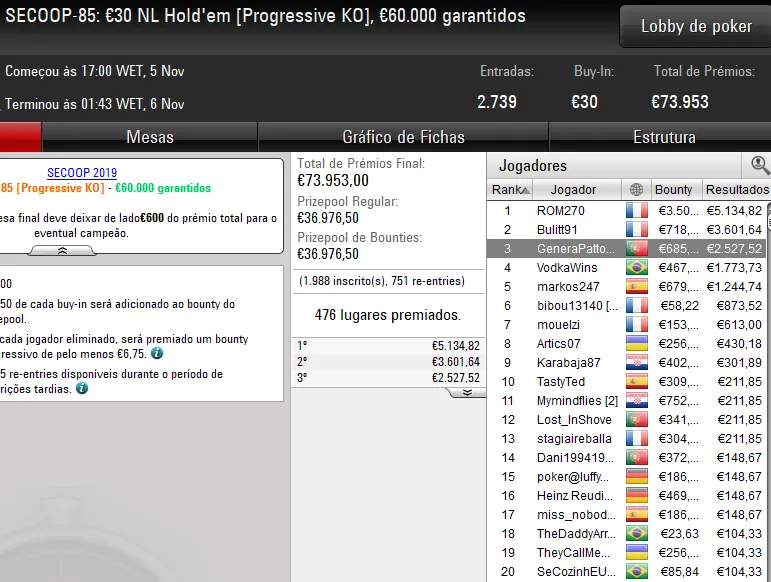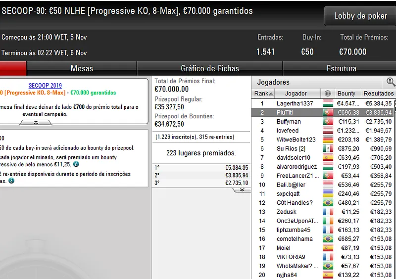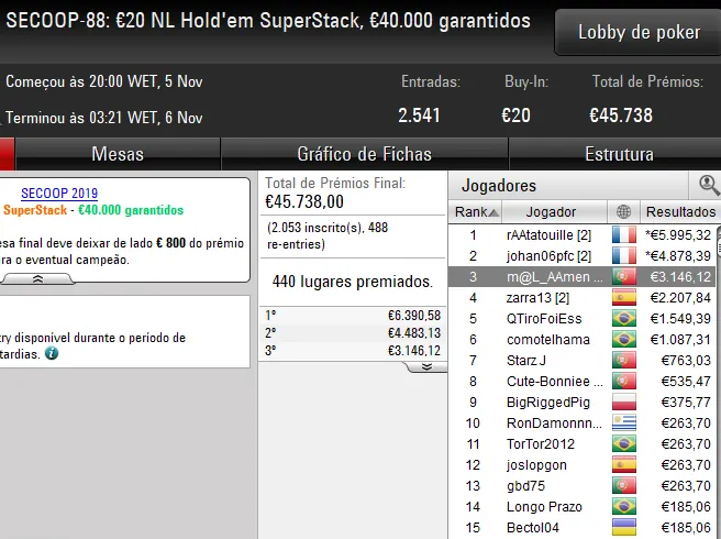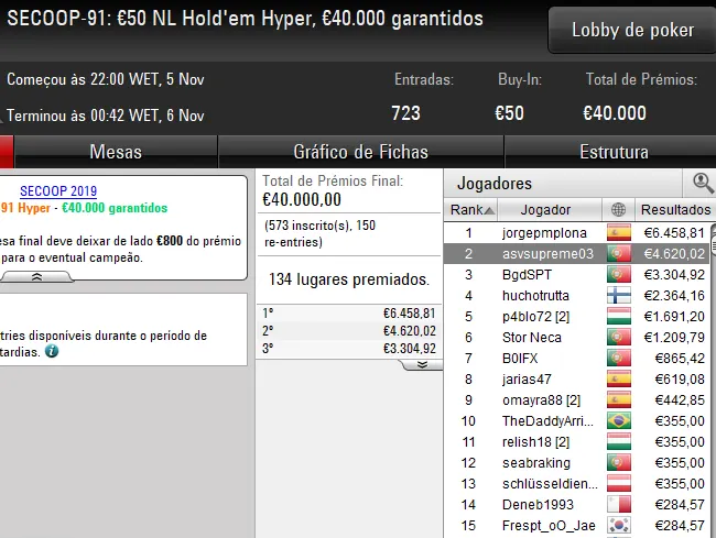 Quem também garantiu uma medalha nos eventos SECOOP desta terça-feira foi o dono da conta TheGandalf28. O luso foi terceiro classificado no SECOOP-87: €50 NLHE [6-Max], torneio que registou 1.562 entradas e mais de €70K em prémios, para engordar a banca com €4.801.