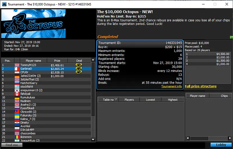 Já na 888poker.com, onde é dono da conta GarbinaD, o luso ficou muito perto da segunda vitória do dia. Hélder esteve entre os três finalistas que chegaram a um acordo no The $10.000 Octopus e terminou no segundo lugar com direito a $2.665.